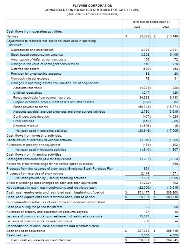 Key Operating Metrics and Non-GAAP Financial Measures table Flywire uses non-GAAP financial measures to supplement financial information presented on a GAAP basis. The Company believes that excluding certain items from its GAAP results allows management to better understand its consolidated financial performance from period to period and better project its future consolidated financial performance as forecasts are developed at a level of detail different from that used to prepare GAAP-based financial measures. Moreover, Flywire believes these non-GAAP financial measures provide its stakeholders with useful information to help them evaluate the Company’s operating results by facilitating an enhanced understanding of the Company’s operating performance and enabling them to make more meaningful period to period comparisons. There are limitations to the use of the non-GAAP financial measures presented here. Flywire’s non-GAAP financial measures may not be comparable to similarly titled measures of other companies. Other companies, including companies in Flywire’s industry, may calculate non-GAAP financial measures differently, limiting the usefulness of those measures for comparative purposes.Flywire uses supplemental measures of its performance which are derived from its consolidated financial information, but which are not presented in its consolidated financial statements prepared in accordance with GAAP. These non-GAAP financial measures include the following: