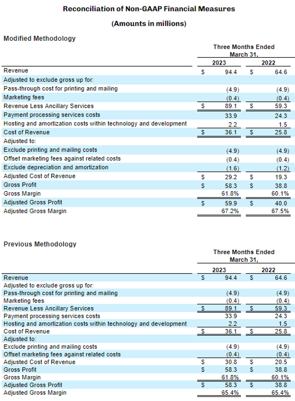 - Adjusted Gross Profit increased to $59.9 million, resulting in Adjusted Gross Margin of 67.2% in the first quarter of 2023, compared to Adjusted Gross Profit of $40.0 million and Adjusted Gross Margin of 67.5% in the first quarter of 2022. Prior year Adjusted Gross Profit and Adjusted Gross Margin have been recast to align with the updated methodology as described in the Key Operating Metrics and Non-GAAP Financial Measures table below.