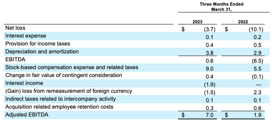 - Adjusted EBITDA was $7.0 million in the first quarter of 2023, compared to $1.9 million in the first quarter of 2022.