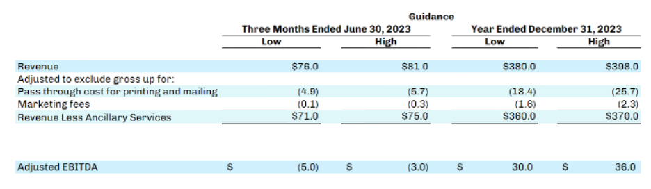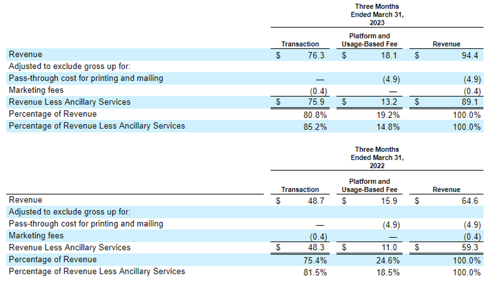 - Revenue Less Ancillary Services. Revenue Less Ancillary Services represents the Company’s consolidated revenue in accordance with GAAP after excluding (i) pass-through cost for printing and mailing services and (ii) marketing fees. The Company excludes these amounts to arrive at this supplemental non-GAAP financial measure as it views these services as ancillary to the primary services it provides to its clients.
