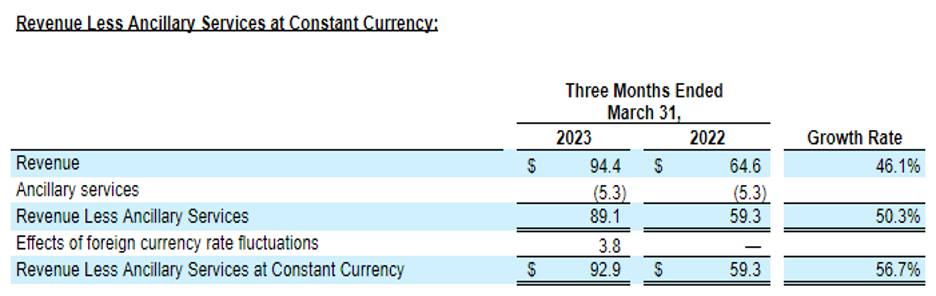 - Revenue Less Ancillary Services increased 50.3% to $89.1 million in the first quarter of 2023, compared to $59.3 million in the first quarter of 2022.