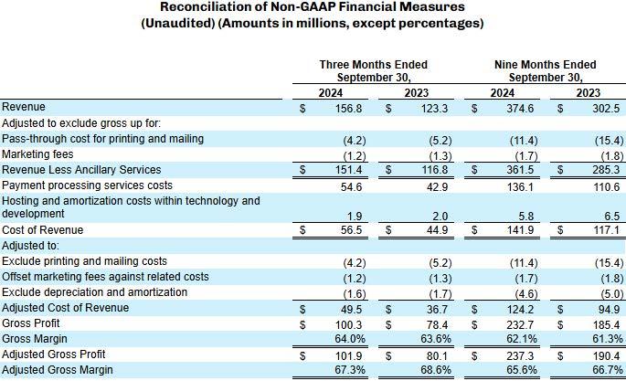 • Adjusted Gross Profit and Adjusted Gross Margin. Adjusted gross profit represents Revenue Less Ancillary Services less cost of revenue adjusted to (i) exclude pass-through cost for printing services, (ii) offset marketing fees against costs incurred and (iii) exclude depreciation and amortization, including accelerated amortization on the impairment of customer set-up costs tied to technology integration. Adjusted Gross Margin represents Adjusted Gross Profit divided by Revenue Less Ancillary Services. Management believes this presentation supplements the GAAP presentation of Gross Margin with a useful measure of the gross margin of the Company’s payment-related services, which are the primary services it provides to its clients.