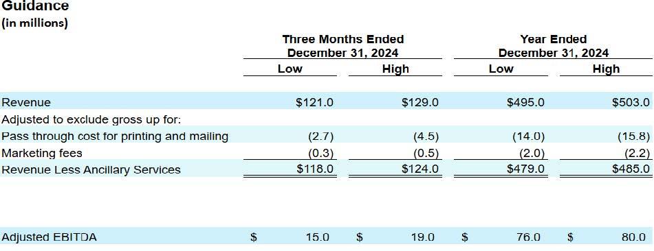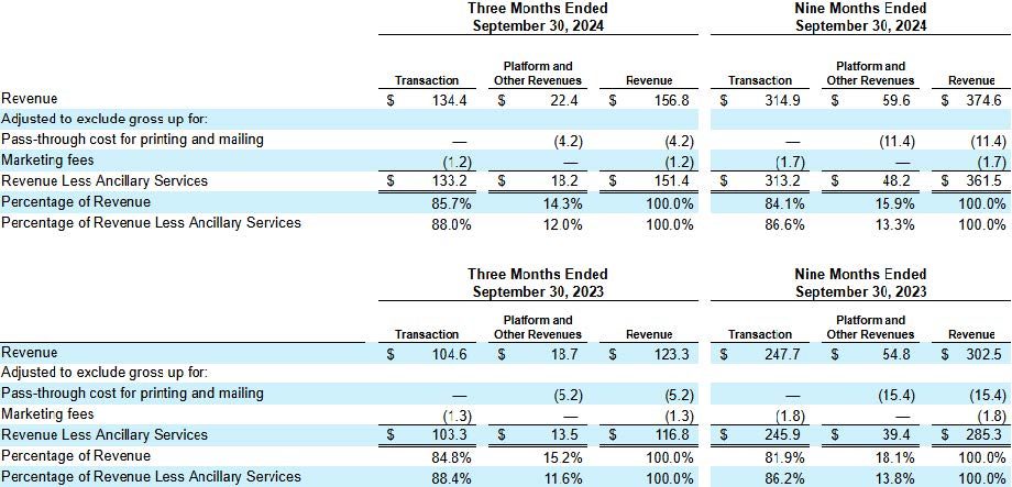 • Revenue Less Ancillary Services. Revenue Less Ancillary Services represents the Company’s consolidated revenue in accordance with GAAP after excluding (i) pass-through cost for printing and mailing services and (ii) marketing fees. The Company excludes these amounts to arrive at this supplemental non-GAAP financial measure as it views these services as ancillary to the primary services it provides to its clients.