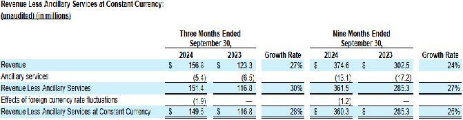 • Revenue Less Ancillary Services increased 29.6% to $151.4 million in the third quarter of 2024, compared to $116.8 million in the third quarter of 2023. Revenue Less Ancillary Services in the third quarter of 2024 was favorably impacted by changes in foreign exchange rates between June 30, 2024 and September 30, 2024 by approximately $2.5 million.