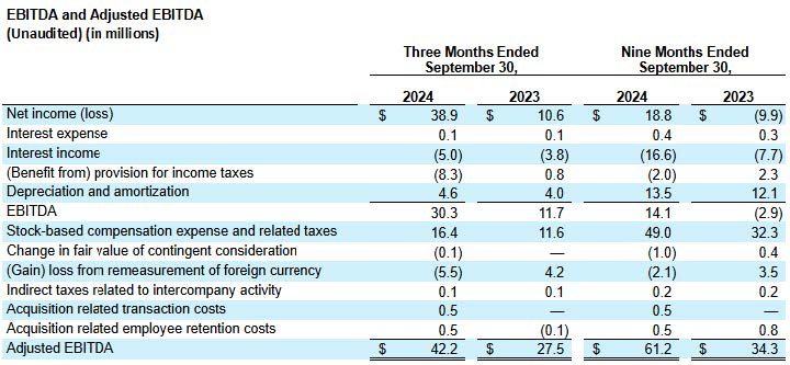 • Adjusted EBITDA increased to $42.2 million in the third quarter of 2024, compared to $27.5 million in the third quarter of 2023. Our adjusted EBITDA margins increased 429 bps year-over-year to 27.9% in the third quarter of 2024.