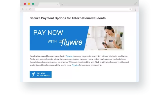 Our link solution allows payers to initiate the payment process from anywhere. When clicking the link from your website, an email, their invoice, or other channel, payers are quickly redirected to Flywire’s payment experience to complete their transaction.